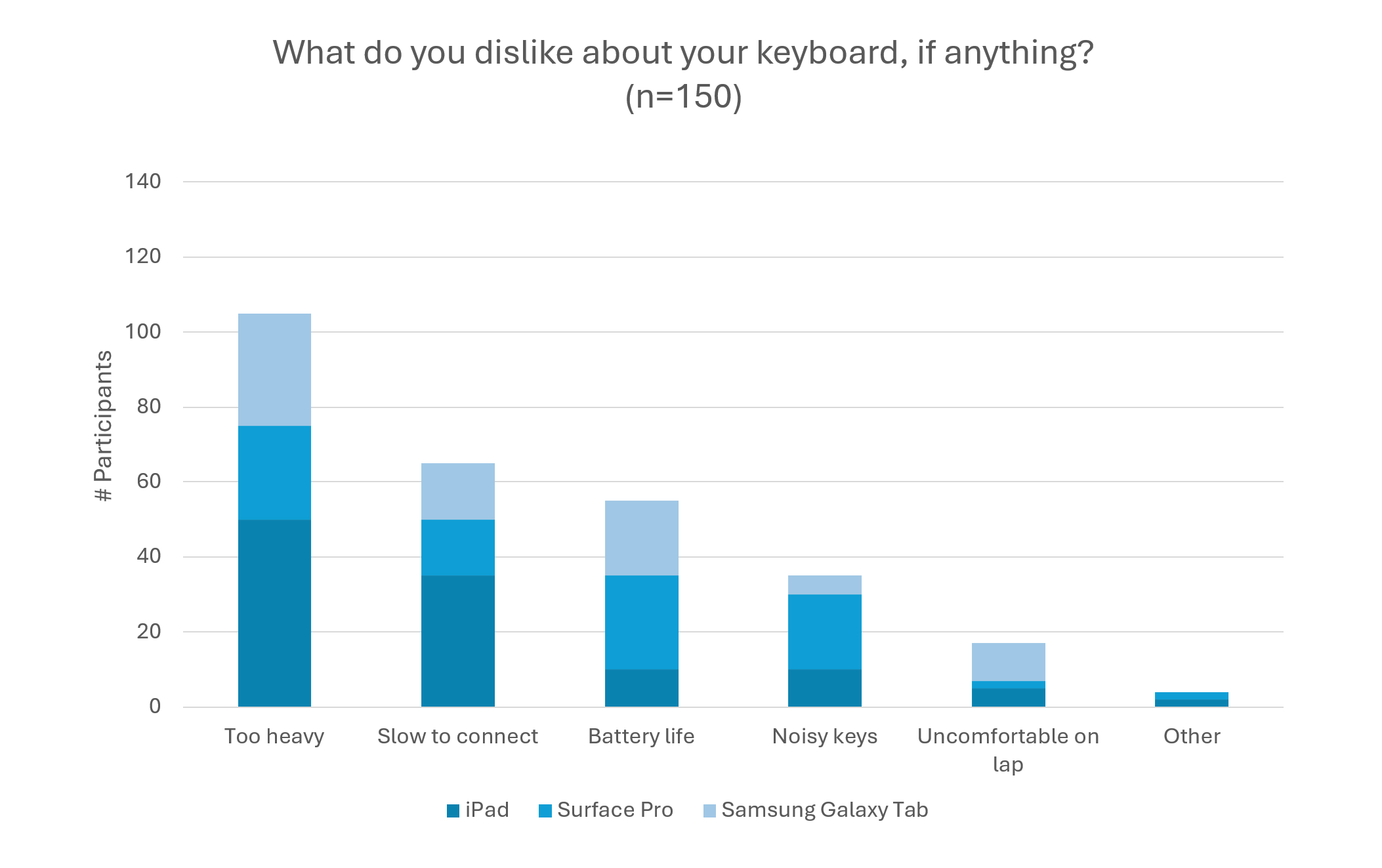 To understand the broader landscape of Bluetooth keyboard use, we began with a large‑scale exploratory survey on Dscout. Participants included tablet 2‑in‑1 device users — both Surface and competitor products — who regularly use a Bluetooth keyboard for personal tasks. This allowed us to capture patterns across a diverse set of ecosystems and usage contexts.