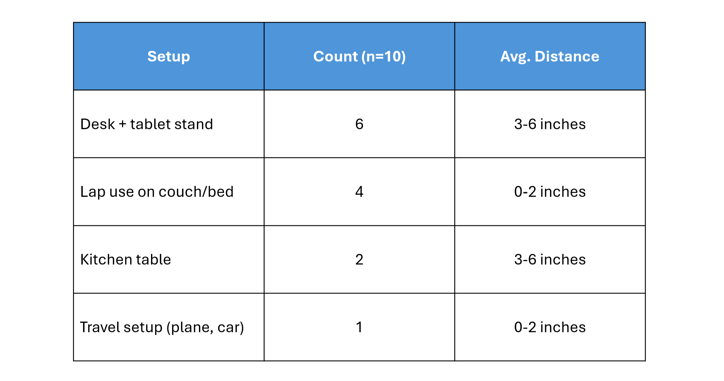 Insight: Participants adapted their keyboard setups across home, travel, and shared environments, revealing posture and distance constraints.