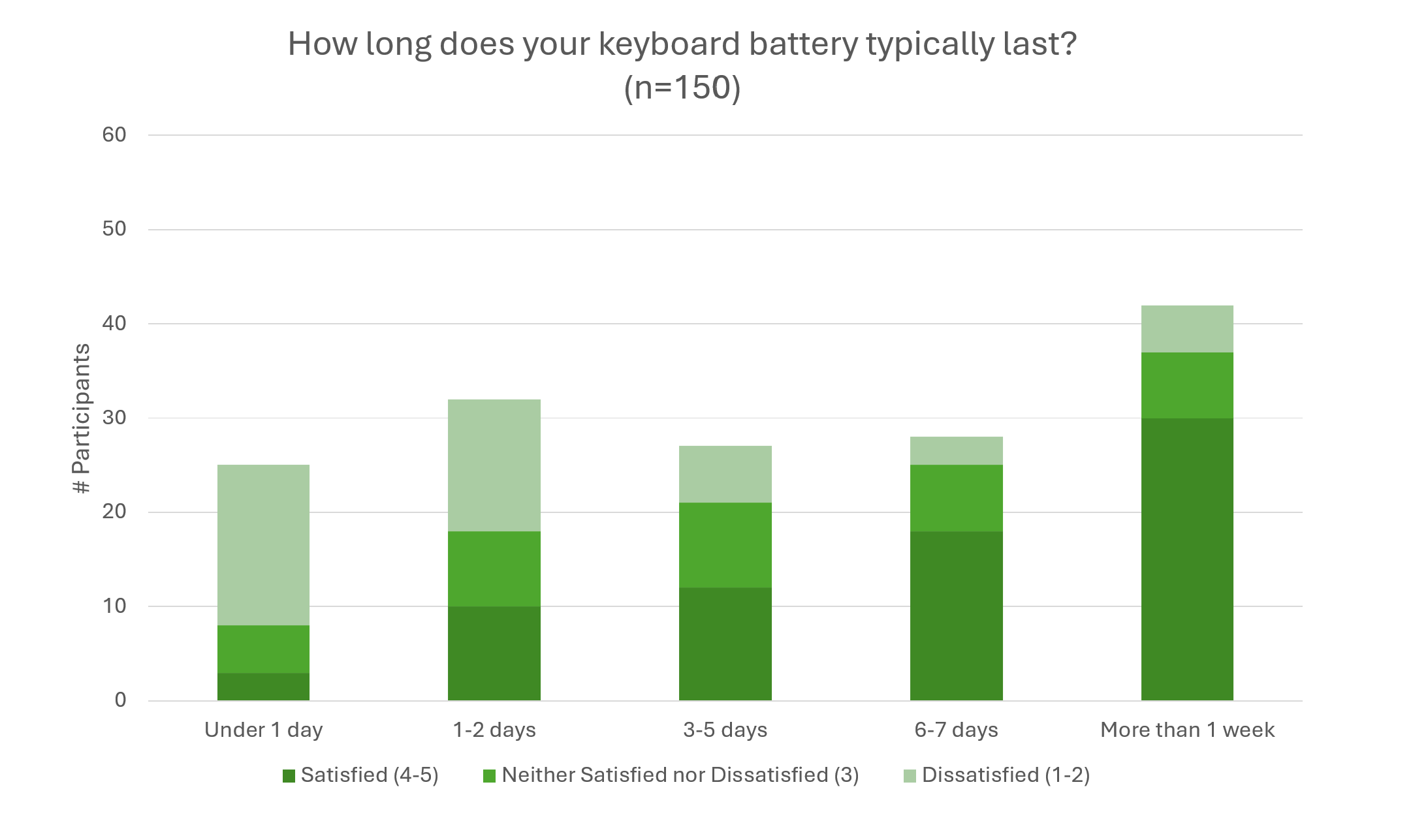 Insight: Battery satisfaction was highest among users reporting longer lifespans, suggesting a gap between expectations and day-to-day performance.